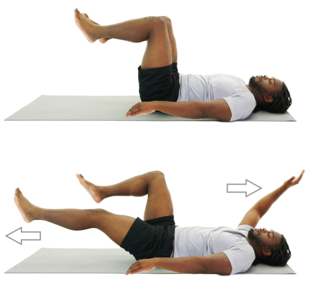 Lie on your back with your knees bent. Next, arch your low back and then flatten it repeatedly. Your pelvis should tilt forward and back during the movement. Move through a comfortable range of motion.