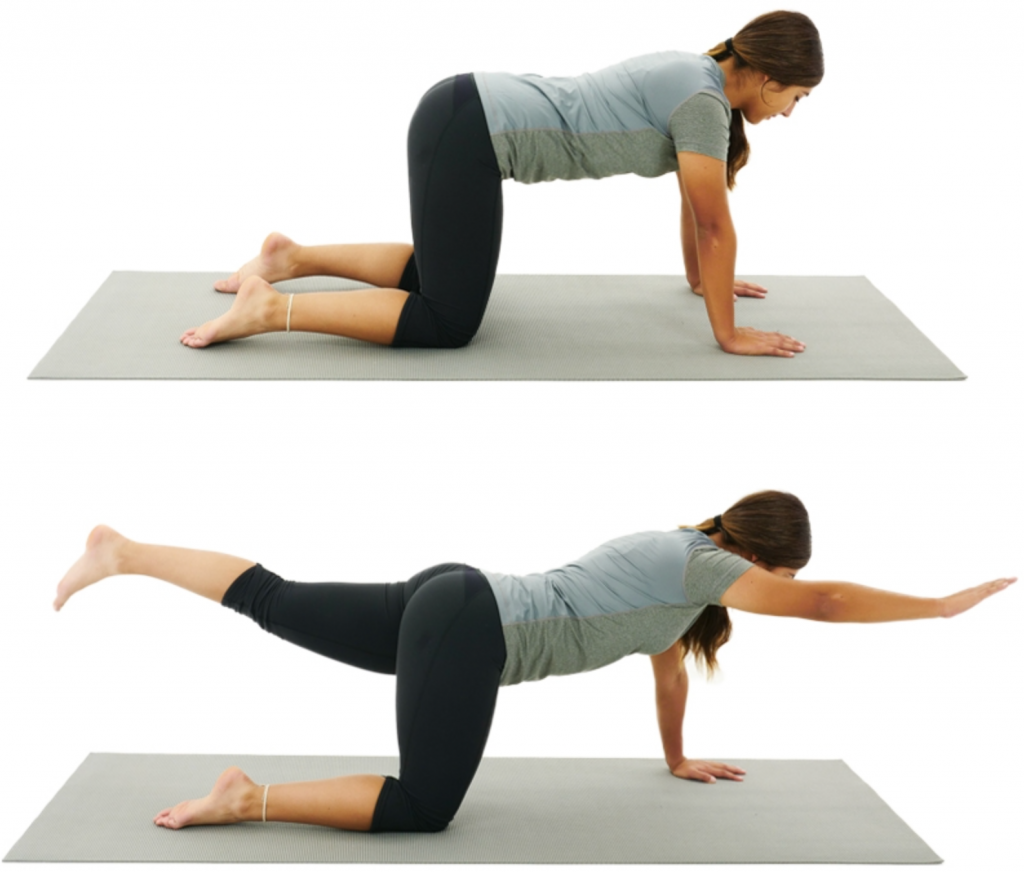 While in a crawling position, tighten/brace at your abdominal muscles and then slowly lift a leg and opposite arm upwards. Your hip will move into hip extension on the way up. Lower leg and arm down and then repeat with opposite side. Maintain a level back and stable pelvis and spine the entire time.